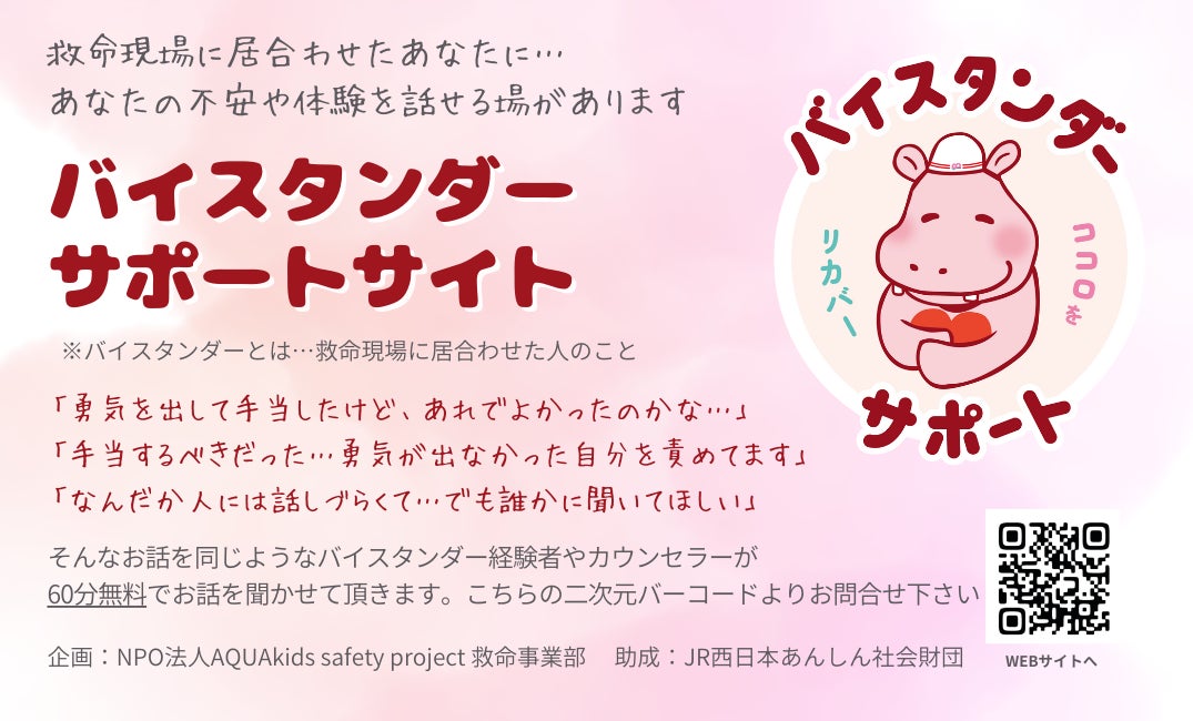また、バイスタンダーに寄り添った窓口「バイスタンダーサポートサイト」(NPO法人AQUAkids safety projectバイスタンダーサポートサイト)もあります。