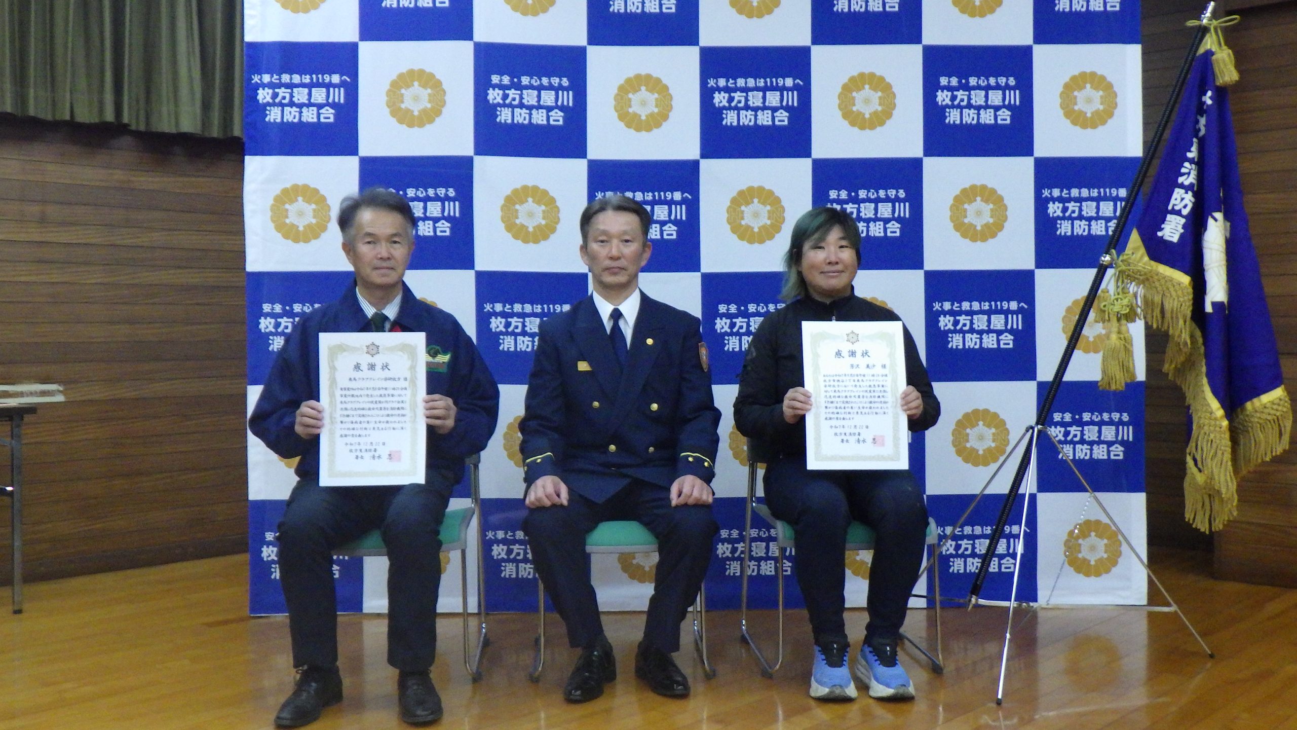 枚方東消防署の管内で発生した救急事案において、市民によって早期発見・通報と応急手当が行われ、尊い命が救われたことに対し、12月22日に枚方東消防署長から感謝状を贈呈しました。